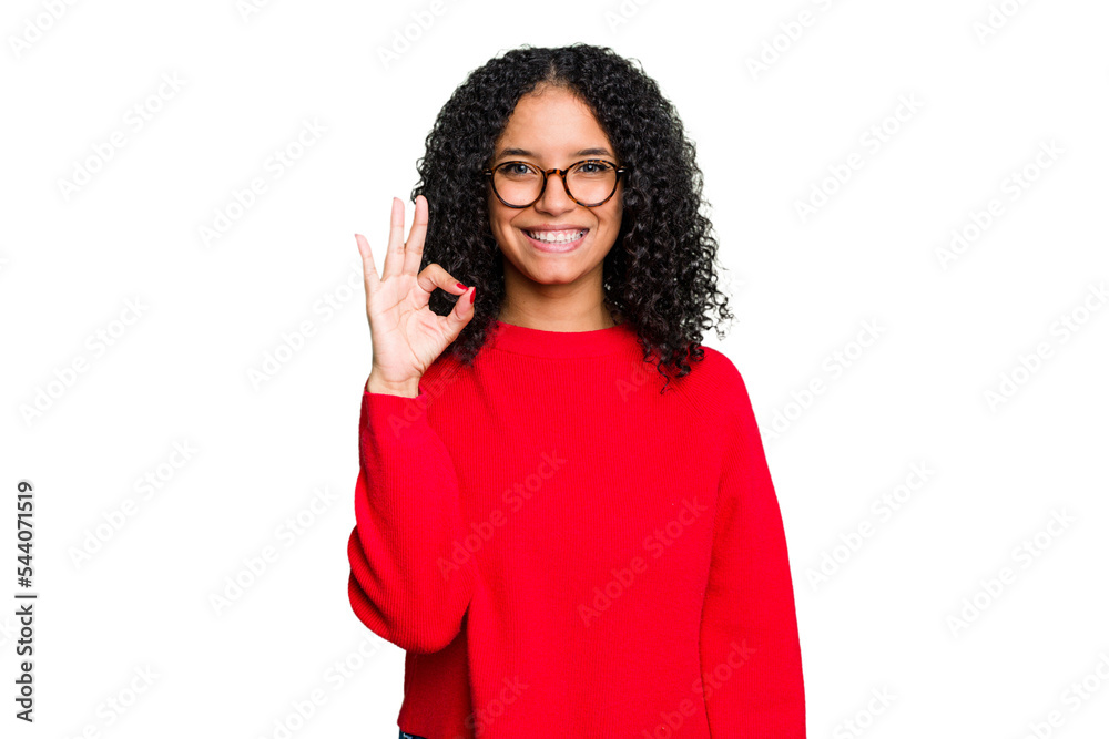 Young cute brazilian woman isolated cheerful and confident showing ok gesture.