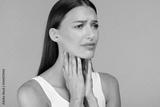 Unhappy caucasian lady suffering from pain in throat, touching her neck, standing over beige background, empty space