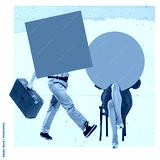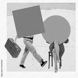 Contemporary art collage of retro couple on pastel background with speech bubble, copy space. Concept of travel, trip, vacation, love, relationship, creativity, imagination, inspiration, ad