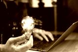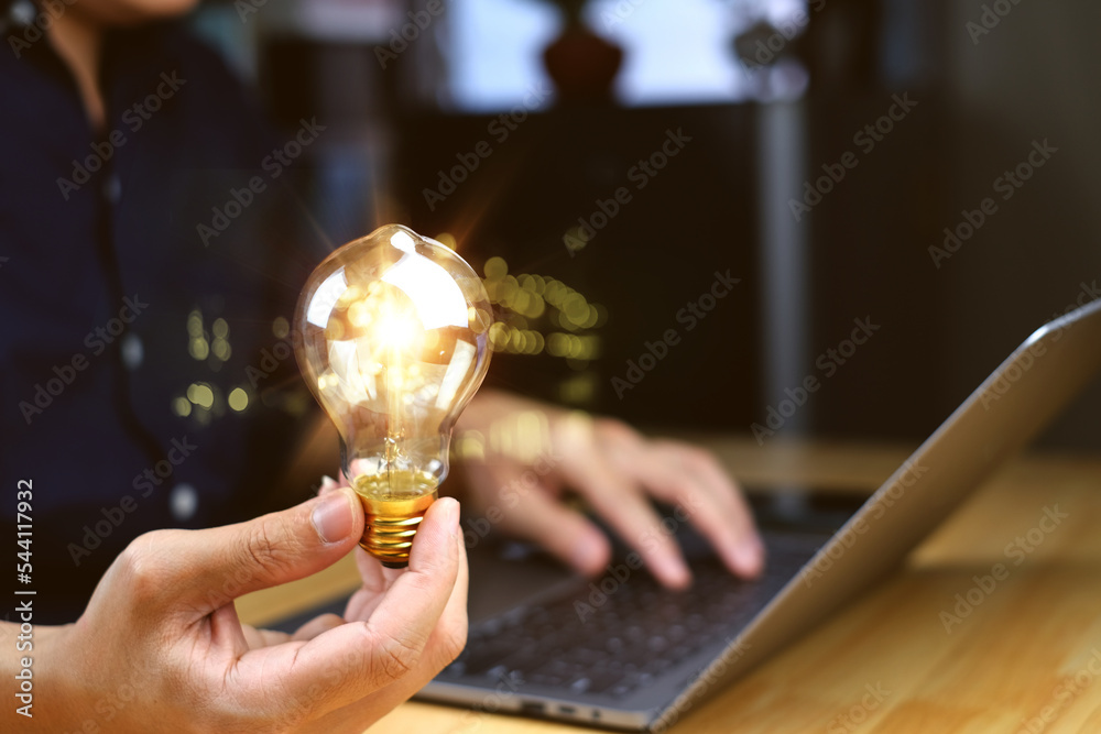 Human hands hold light bulbs and labtop ideas. new concept that is innovative and inspiring For everything in the world, technology, innovation in science and communication concepts.