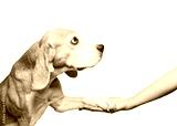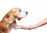 A portrait of a beagle dog giving its paw the owner's outstretched hand. Close up. Isolated on white background. Side view. Suitable for collage and banner making and any other design