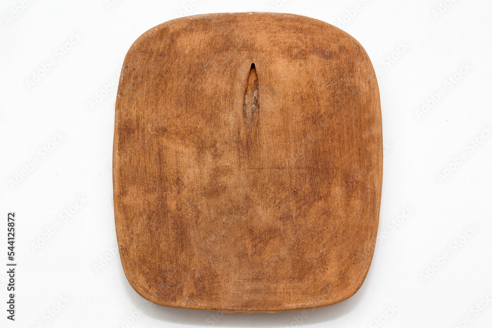 Clay supply on a white background. Wooden flat board. Ceramic plate on a light background. Textures for advertising. The brown square is cut out. Piece of brick.