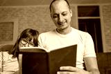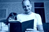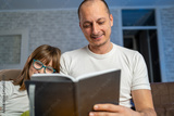 Happy father and daughter are reading a book and smiling while spending time together at home.