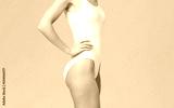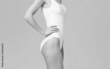 Young, fit and beautiful blond woman in white swimsuit posing over grey background. Healthcare, diet, sport and fitness concept.