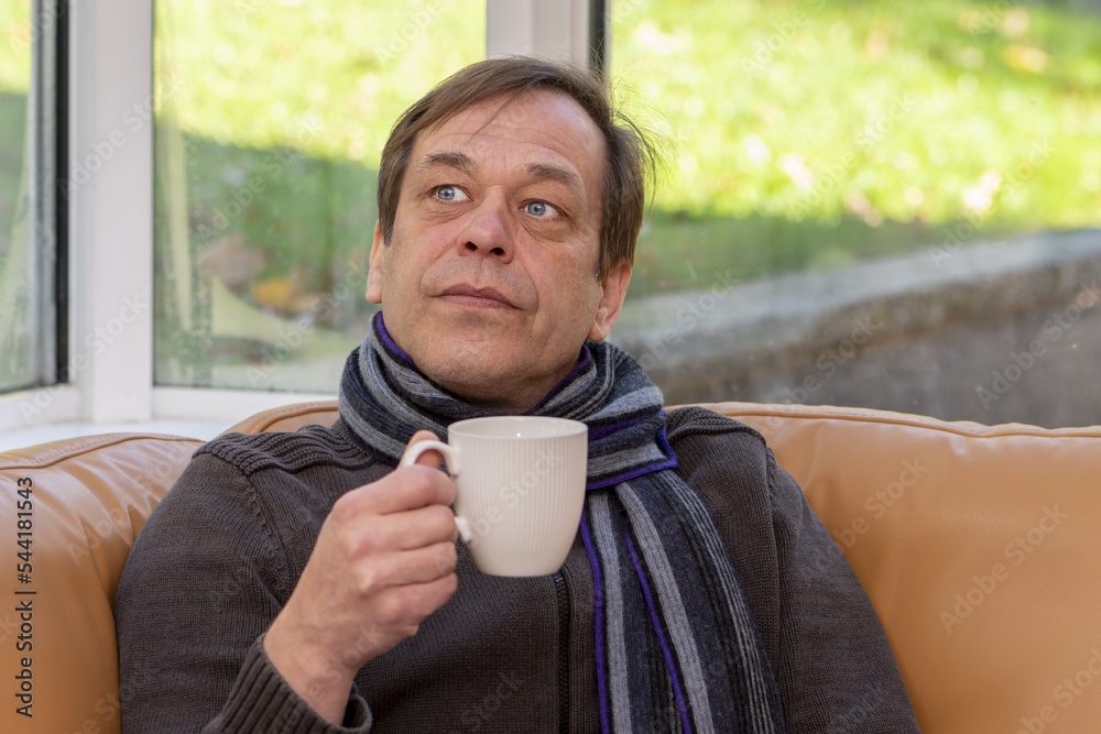 Portrait of a thoughtful man with a white mug in his hand and a scarf, sitting in a leather armchair on a glazed terrace.