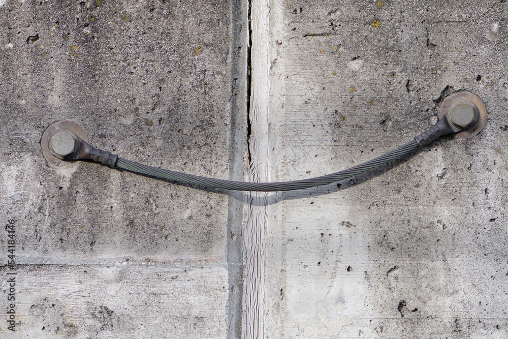 A thick metal cable or cable is bolted between concrete slabs, grounding the building and relieving static tension at metro stations.