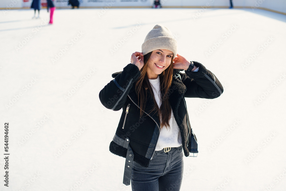Beautiful woman at stylish jacket having fun, laugh on outdoor ice skating rink. Cheerful pretty young woman skate on Christmas ice rink. Winter holiday outside activity