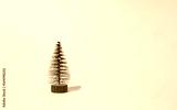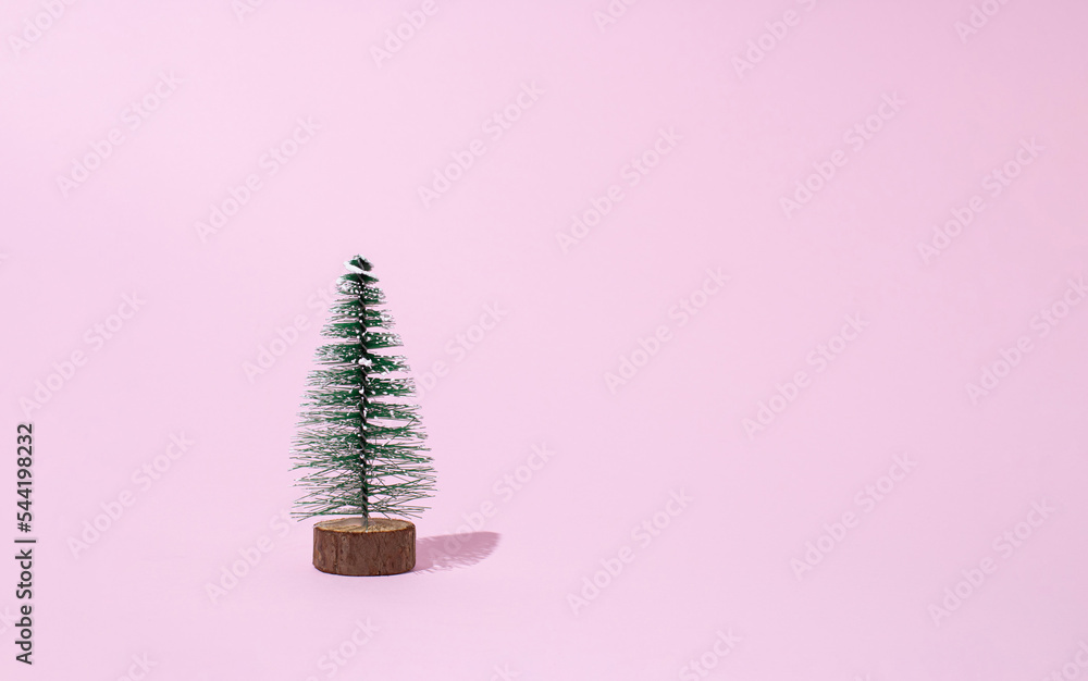 Christmas tree isolated on pastel pink background. Wintertime. Holiday concept. Copy space.