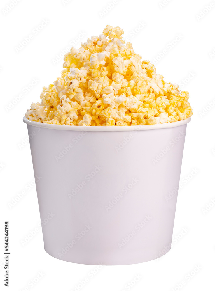 Popcorn in white paper bucket cardboard on white background, Popcorn on white background PNG File.