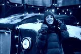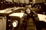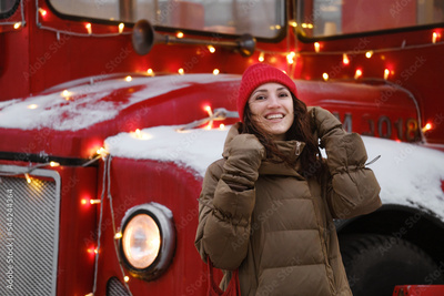 Happy Woman near London double decker red old bus in winter smiling, enjoy snow. Christmas mood holiday cafe