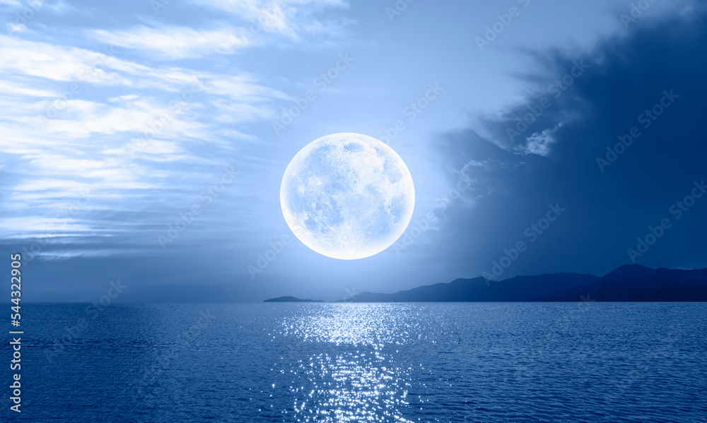 Night sky with blue moon in the clouds over the calm blue sea "Elements of this image furnished by NASA