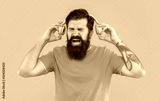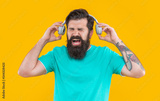 annoyed man shout and has loud music in headphones isolated on yellow. annoyed man listen loud music