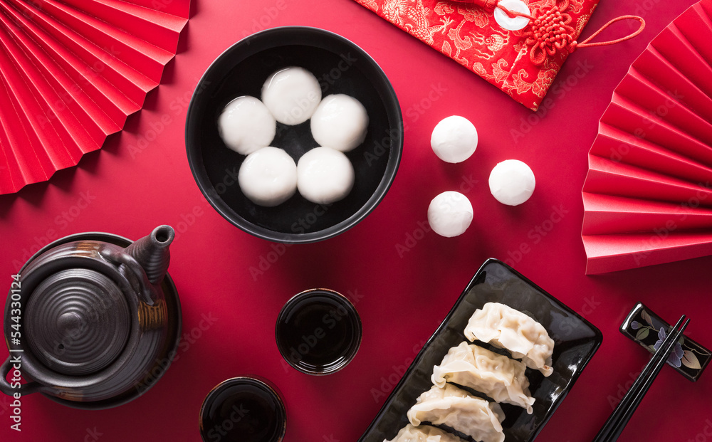 Tang Yuan(sweet dumplings balls), a traditional cuisine for Mid-autumn, Dongzhi (winter solstice ) and Chinese new year with plum flower and tea on red background.