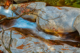 autumn landscape with red leaves and river streams, branch in foreground, long exposure