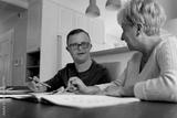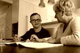 Caucasian man with down syndrome learning with his mum at home