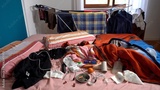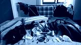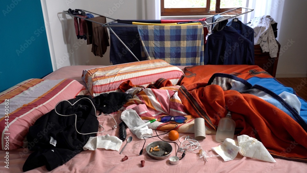 Dirty and messy bedroom. Unmade sleeping bed with various items scattered around in a dirty and neglected house, . Domestic cleaning and personal well-being. ashtray with unlit cigarettes and objects