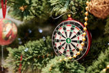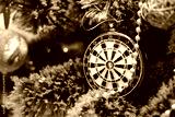 Close up picture of christmas ornaments on green artificial Xmas tree. Red and golden glass darts bauble, bead garland hanging on pine. Holiday atmosphere. New year celebration. Old decorations.