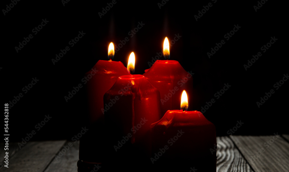 Four red candles light on dark room with dark background
