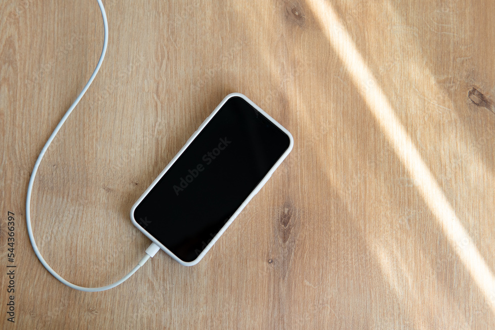 the phone is charging. smartphone on charging with a wire on a wooden table.