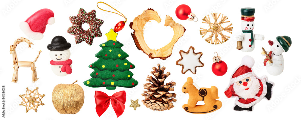 Christmas decoration set. PNG with transparent background. Flat lay. Without shadow.