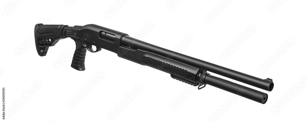 Pump-action 12 gauge shotgun isolated on a white back. A smooth-bore weapon with a plastic stock.