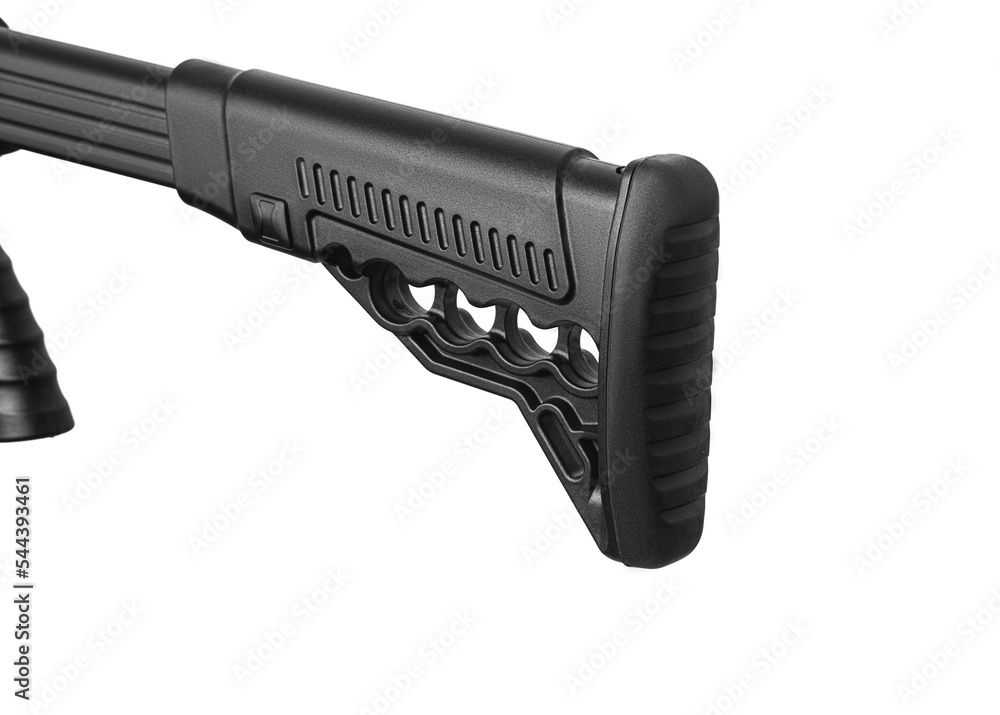 Pump-action 12 gauge shotgun isolated on a white back. A smooth-bore weapon with a plastic stock.