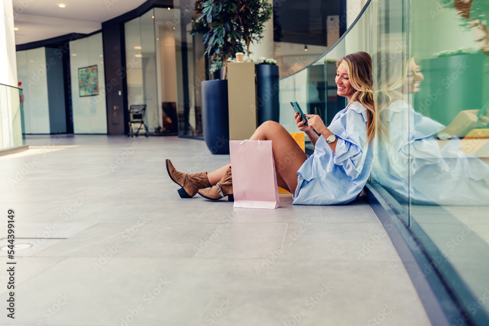 Cropped shot portrait of a happy shopper shopping paying with credit card online with a smart phone in a Mall. Shopper shopping paying with credit card online
