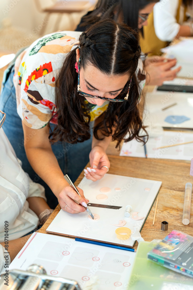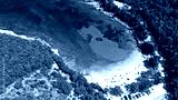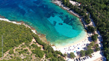 Aerial drone top down photo of tropical exotic paradise secluded rocky bay with deep turquoise sea forming a blue lagoon