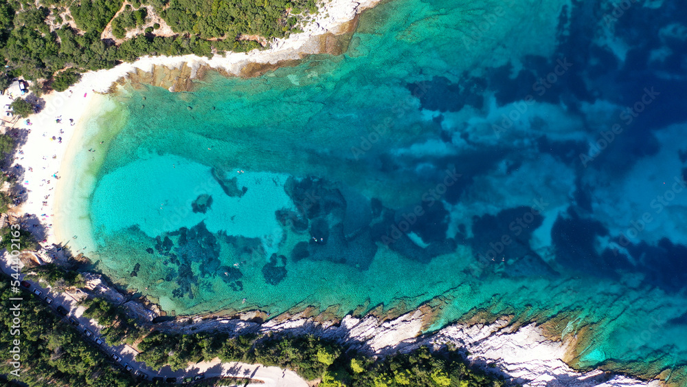 Aerial drone top down photo of tropical exotic paradise secluded rocky bay with deep turquoise sea forming a blue lagoon