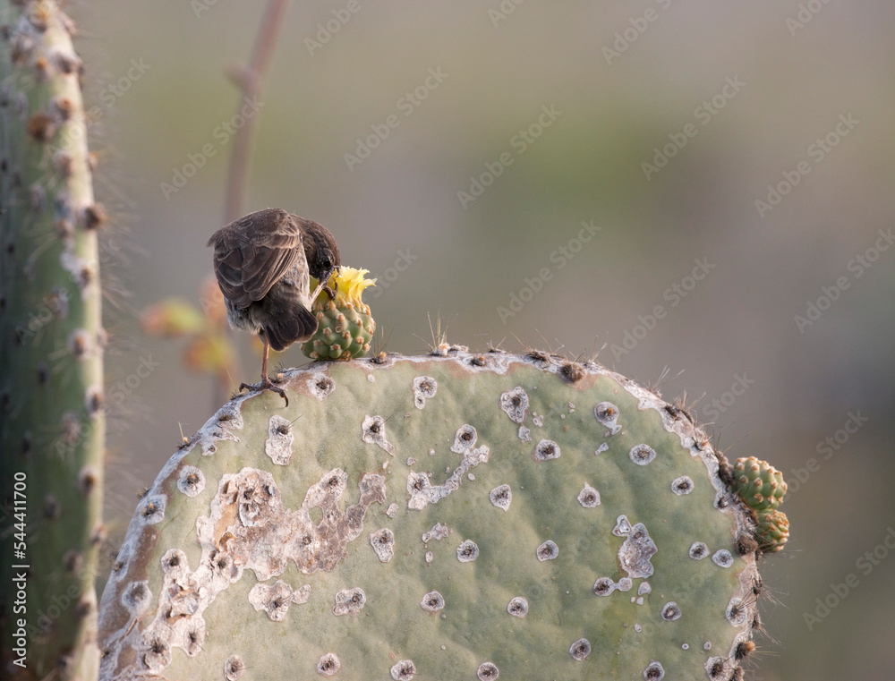 cactus finch feeding on prickly pear cactus, Rabida Island, Galapagos