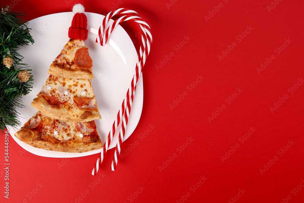 New Year. Christmas. pizza.new year's pizza. pizza chunks are in the shape of a Christmas tree. New Year's composition on a plate.