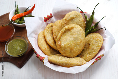 Shegaon Kachori or aloo pyaz ki kachodi served with green and red Chutney. Fried green chilies. it's a favorite Tea time snack, stuffed with lentils and spices mixture inside the dough. Deep fried.