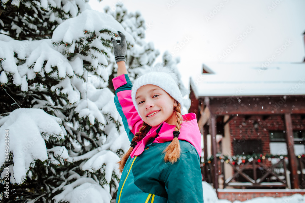 Girl in winter hat is posing with snowed tree against decorated home background