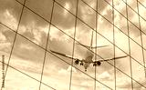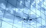 White Passenger plane fly up over take-off runway from airport - Airplane reflected in skyscraper windows
