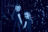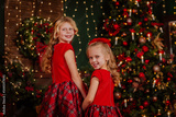 Two blond girls with curly hair in red dresses and bows are posing in the room