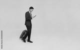 handsome Asian businessman using smartphone and walking in an empty airport hall with a suitcase isolated on studio white background.