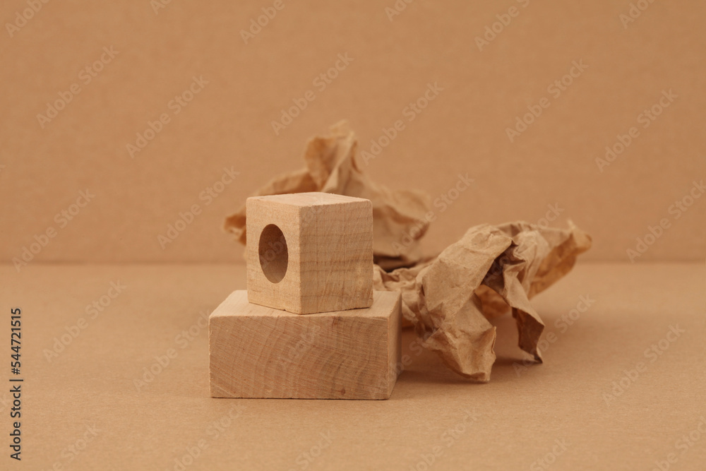Wooden eco rustic platform podium on beige. Minimal empty display product presentation scene.
