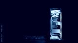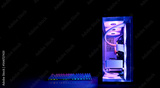 Gaming PC with rainbow LED light. Modern liquid cooled gaming computer. Powerful PC in a glass case, front view.