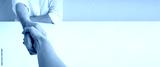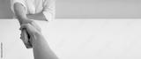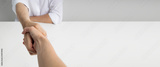 Handshake male and female hand at the table on a white background. Banner