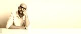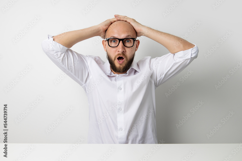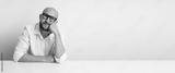 Pensive young man holding hand under chin while sitting at table on white background. Banner