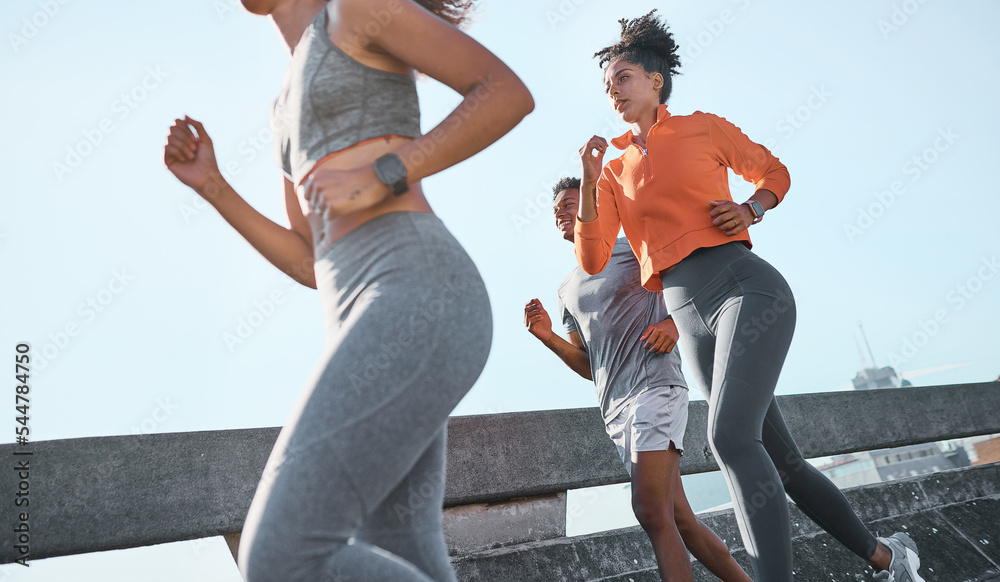 Women, black man and running in city fitness, workout or exercise for cardio health, wellness or marathon training. Sports people, friends or runner athletes on New York street with energy or speed