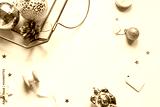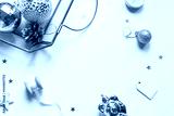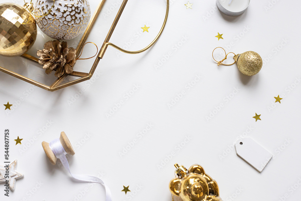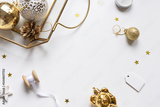 Christmas celebration concept frame with golden and white decoration on the table. Copy space