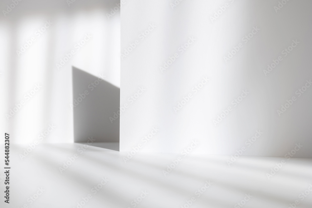 Abstract white studio background for product presentation. Empty gray room with shadows of window. Display product with blurred backdrop.