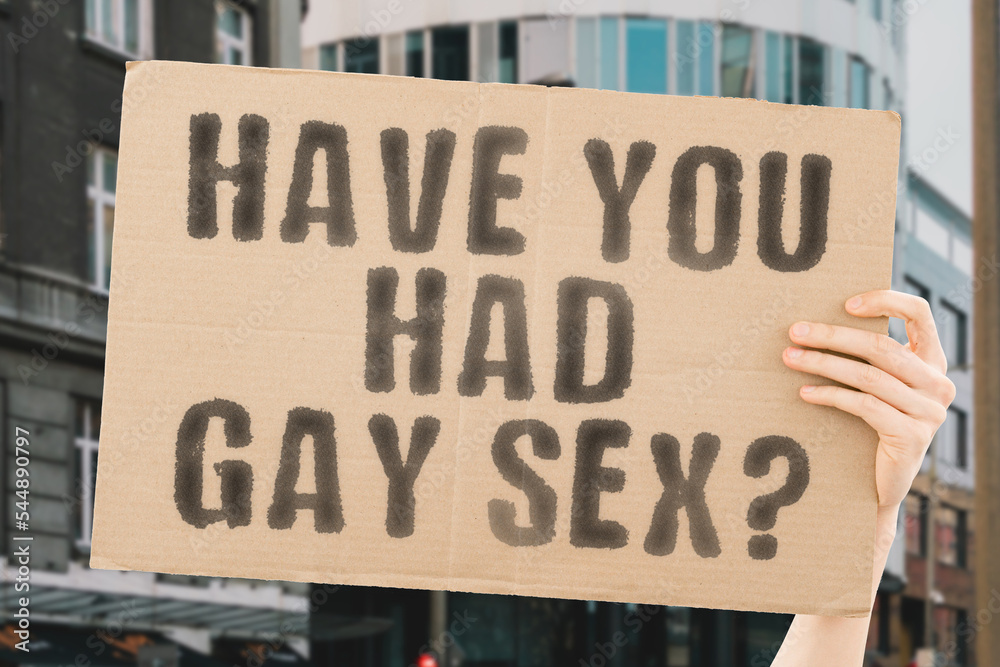The question " Have you had gay sex? " is on a banner in men's hands with blurred background. Illegal. Love. Prohibit. Healthy. Adult. Immoral. Behavior. Bisexuality. Sensual. Affection. Desire
