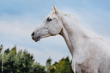 White arabian horse with blue sky looking curious