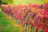 Rows of vineyard with red and yellow orange leaves at sunset.Vine vines in autumn .Lambrusco vineyards Castelvetro, Modena province, Emilia Romagna, Italy.
