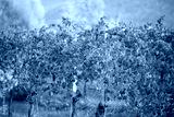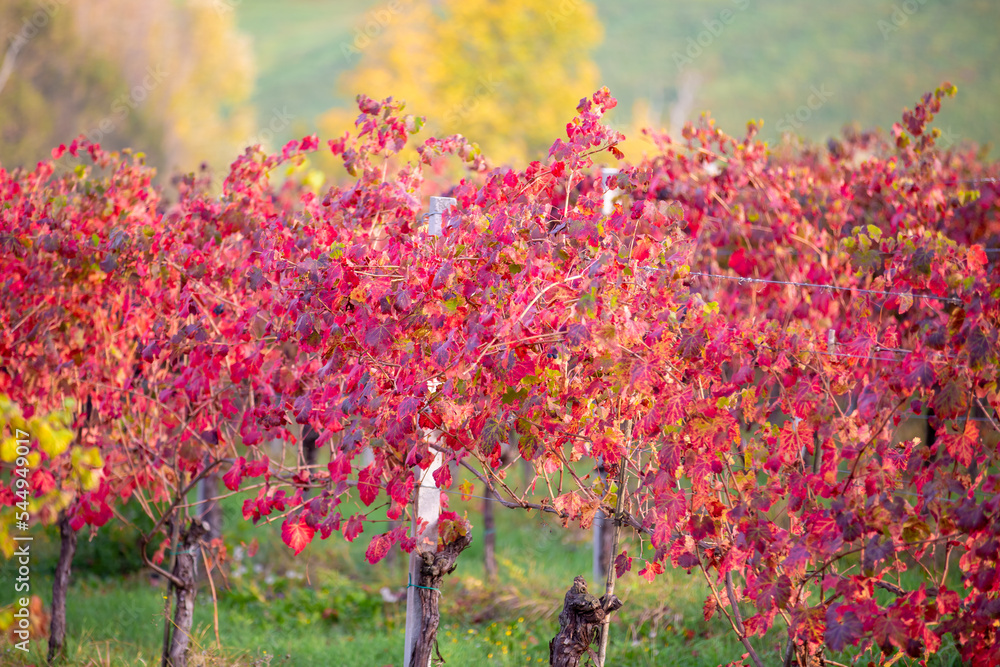 Rows of vineyard with red and yellow orange leaves at sunset.Vine vines in autumn .Lambrusco vineyards Castelvetro, Modena province, Emilia Romagna, Italy.