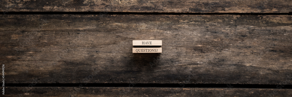 Wide view image of two stacked wooden pegs with a Got questions? sign on them