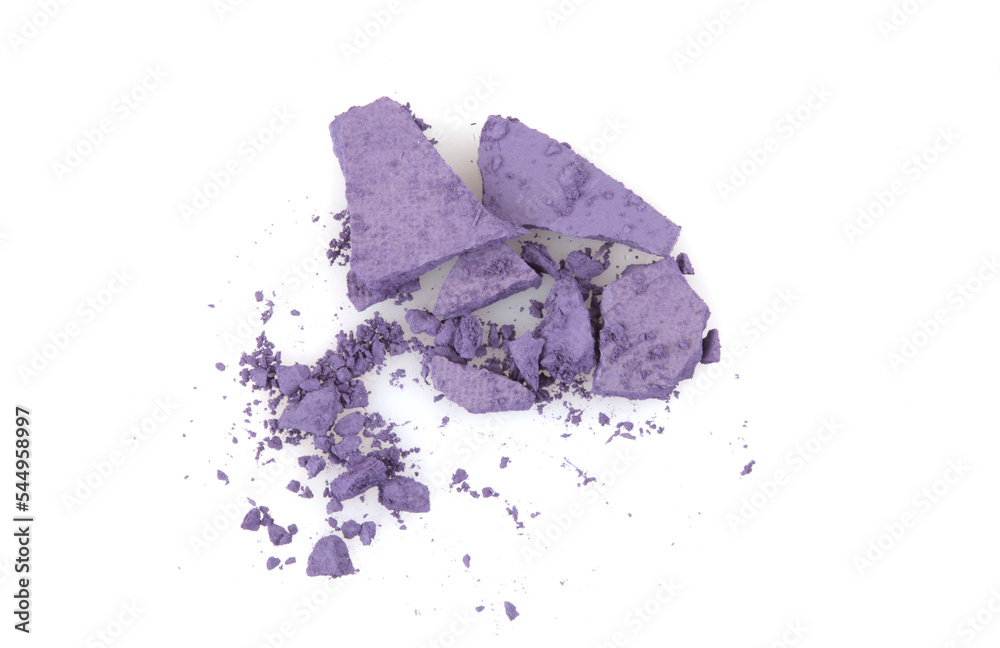 Crumble and crushe violet eyeshadows, powder. Broken cosmetics on white background..