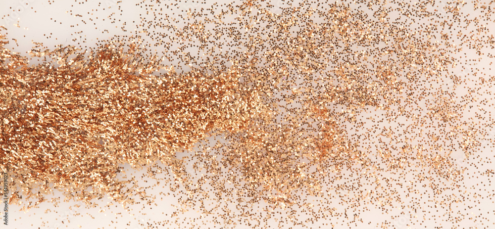 Abstract light Gold (bronze) glitter shine dots confetti on beige horizontal backgound.